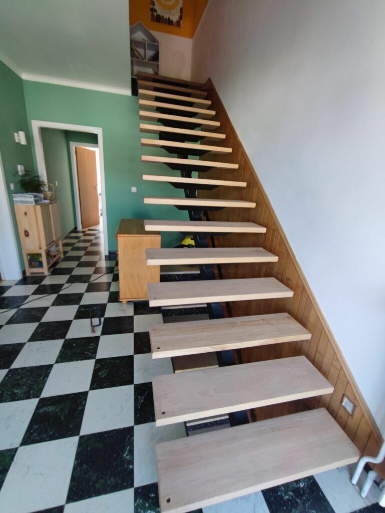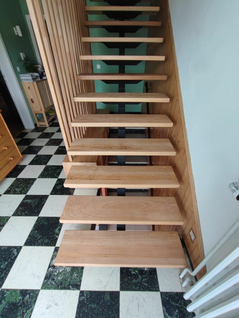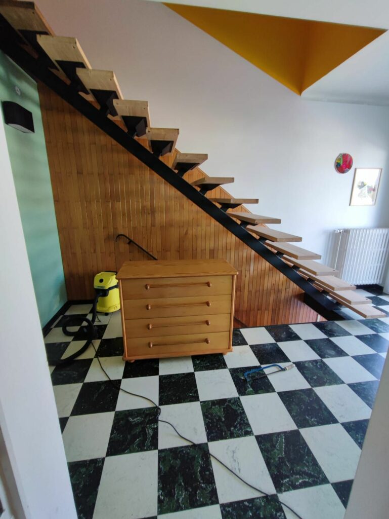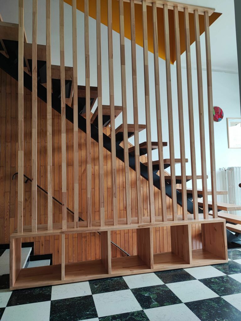 Restauration d’un escalier avec conception d’un meuble d’entrée, hall 70’s