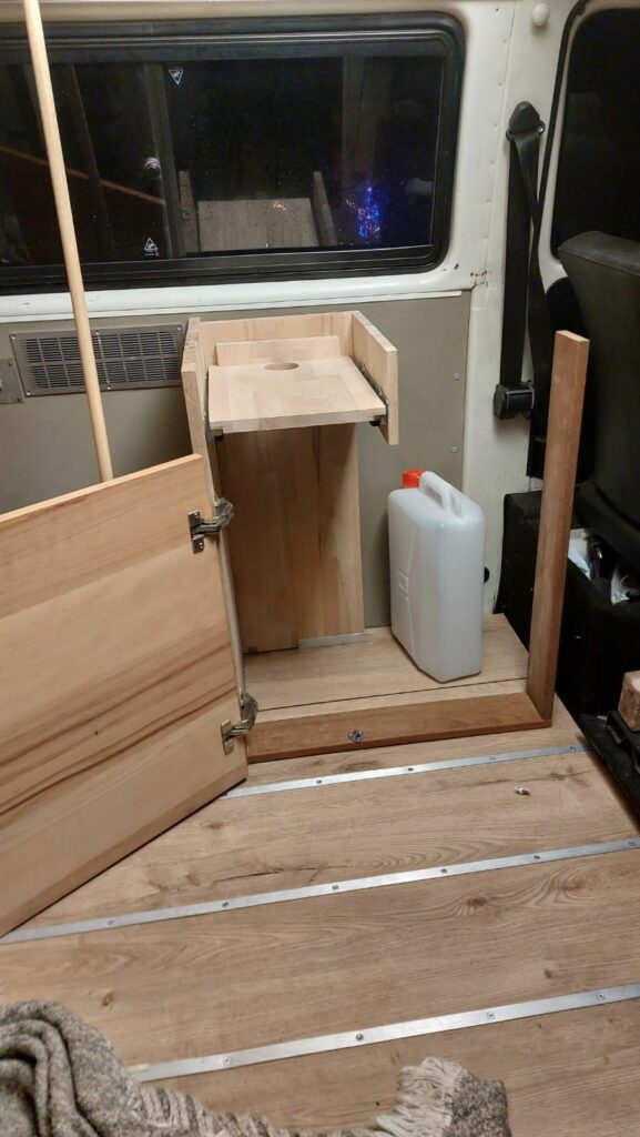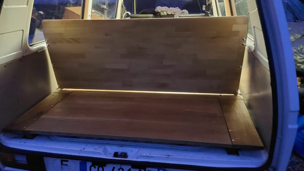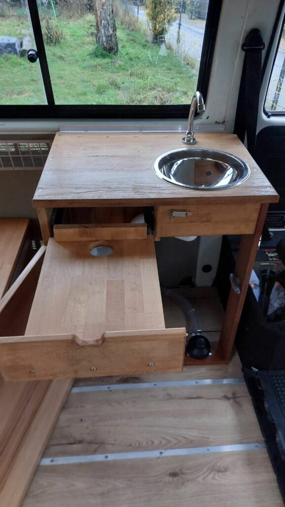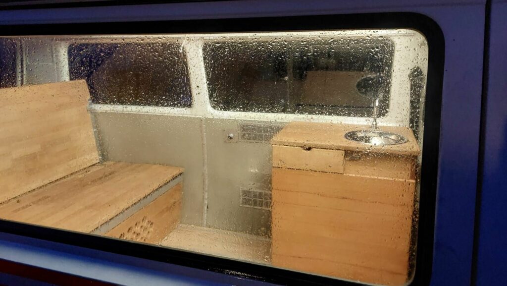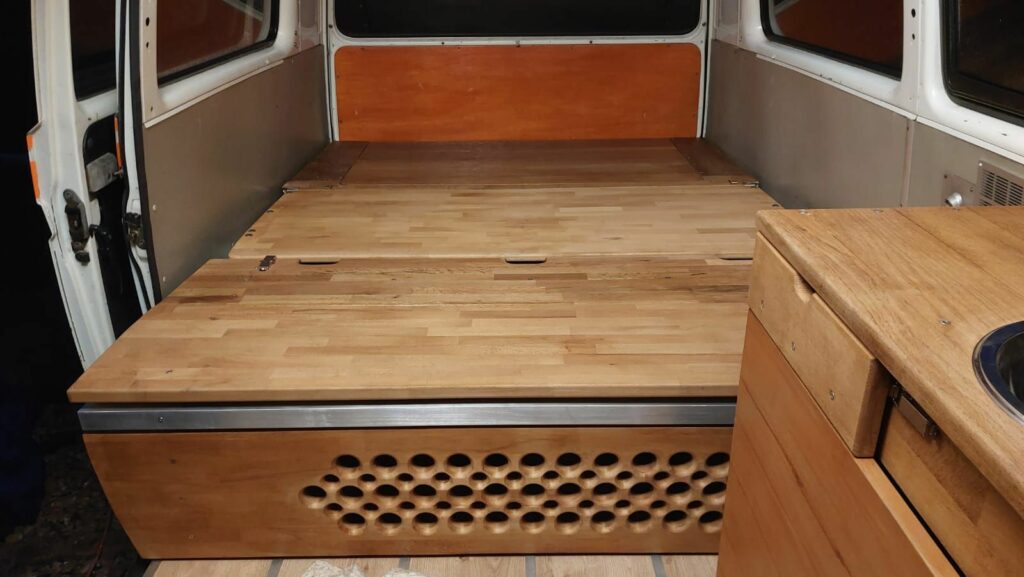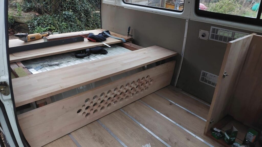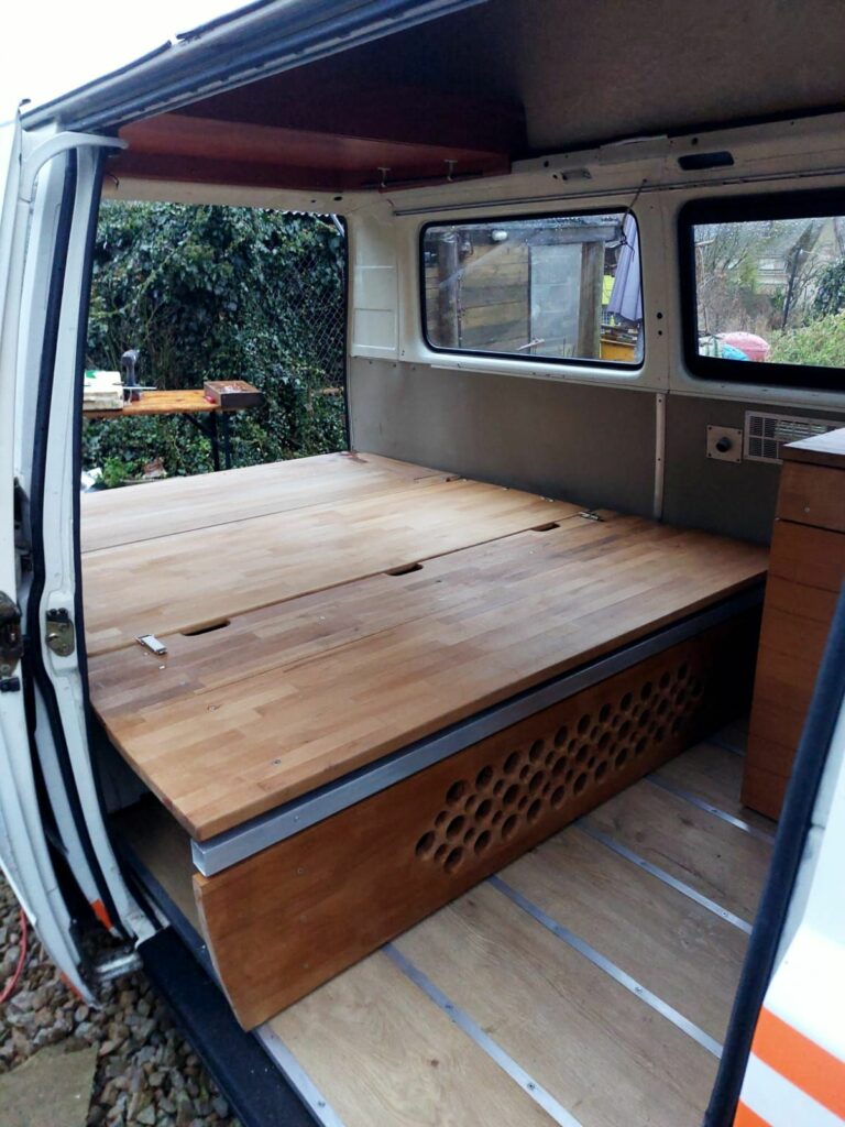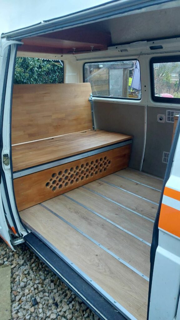 Conception banquette et mobilier pour camper vintage et meuble évier, pour le Van Volswagen T3