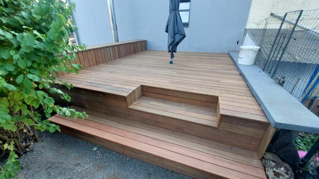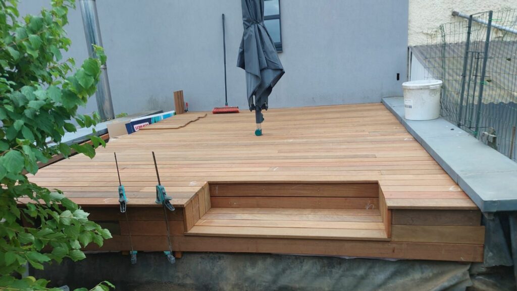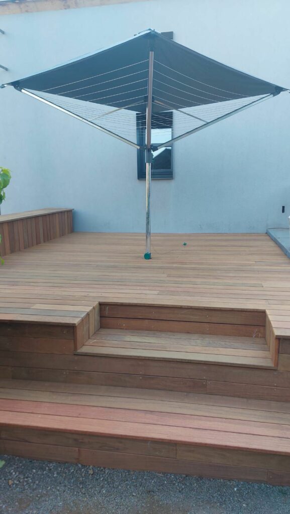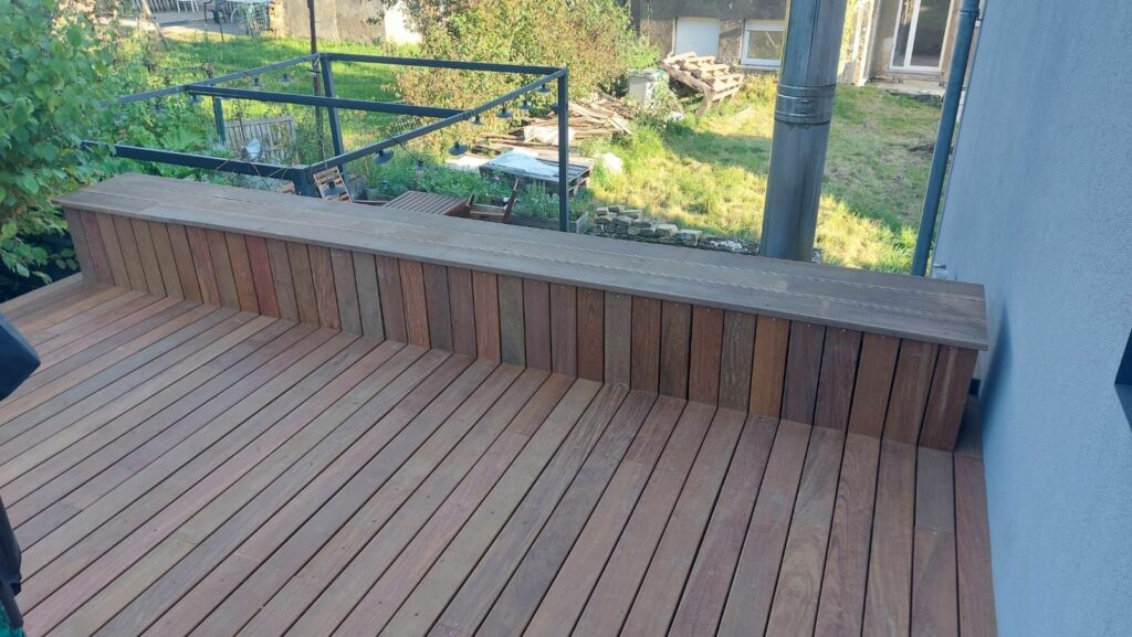 Conception Mobilier terrasse avec banc d’assise intégré + fixation d’un étendoir parasole